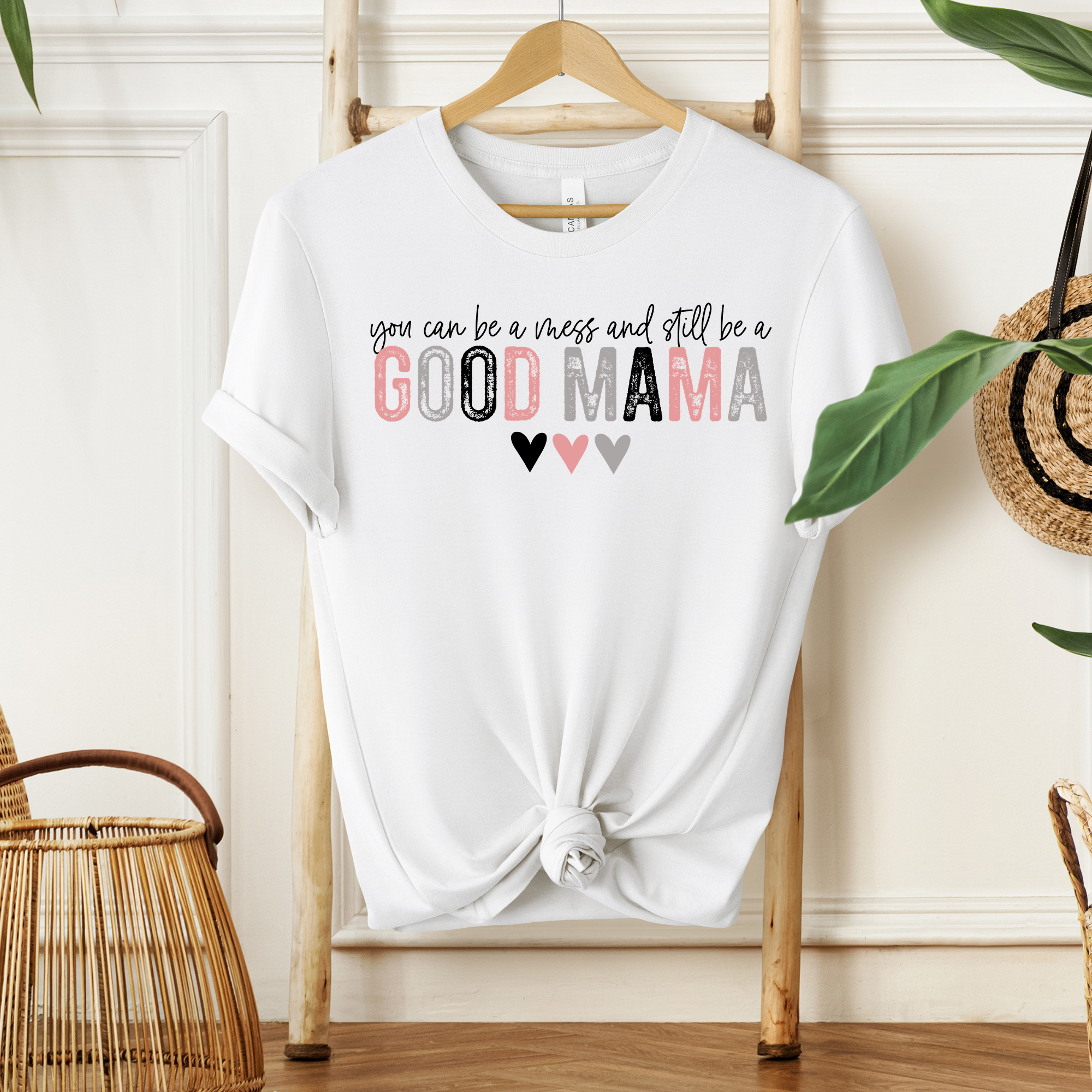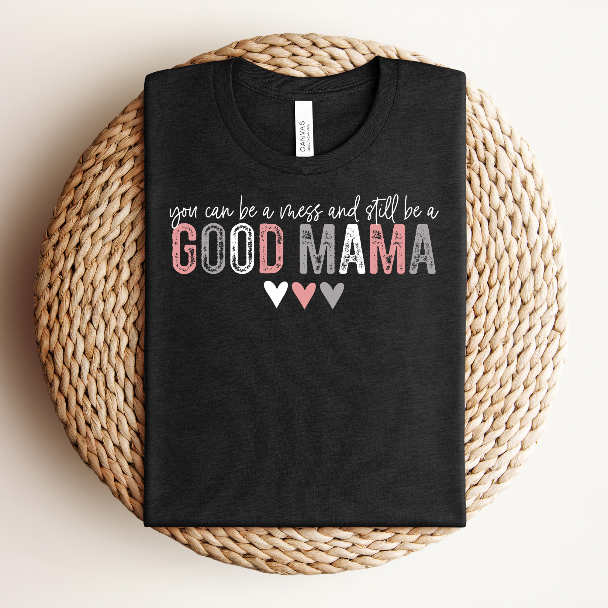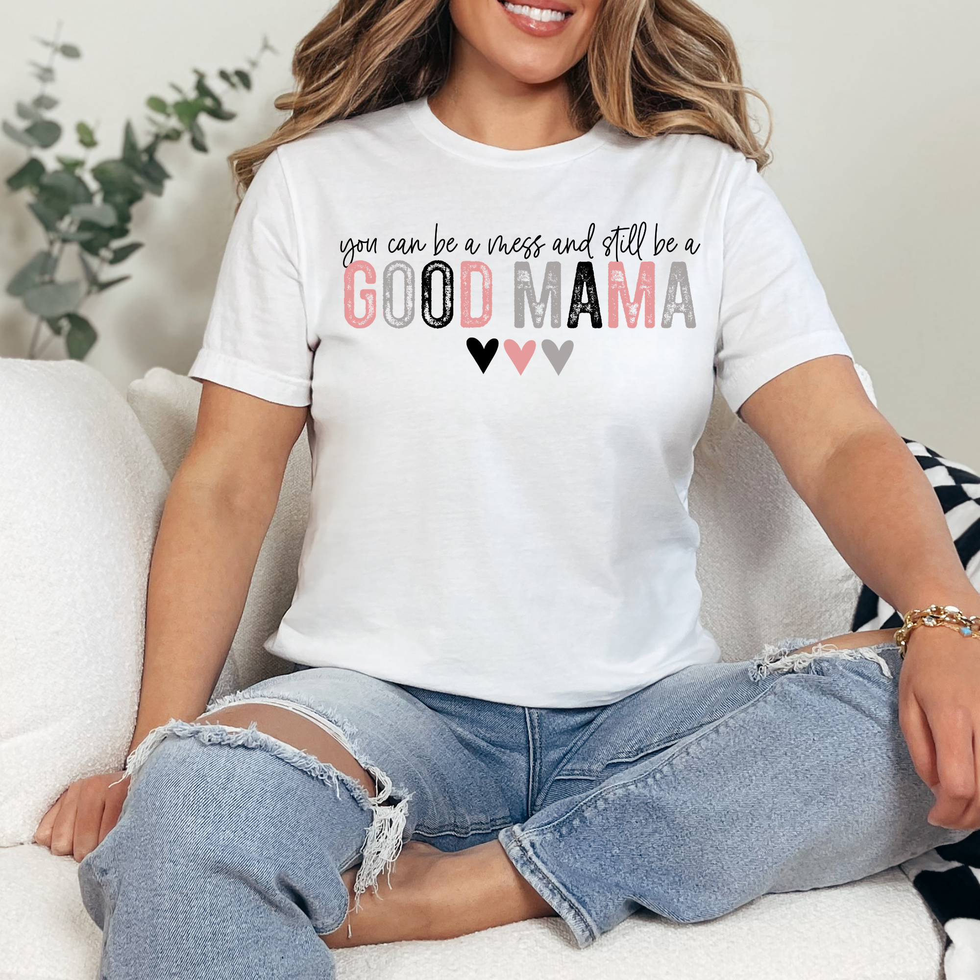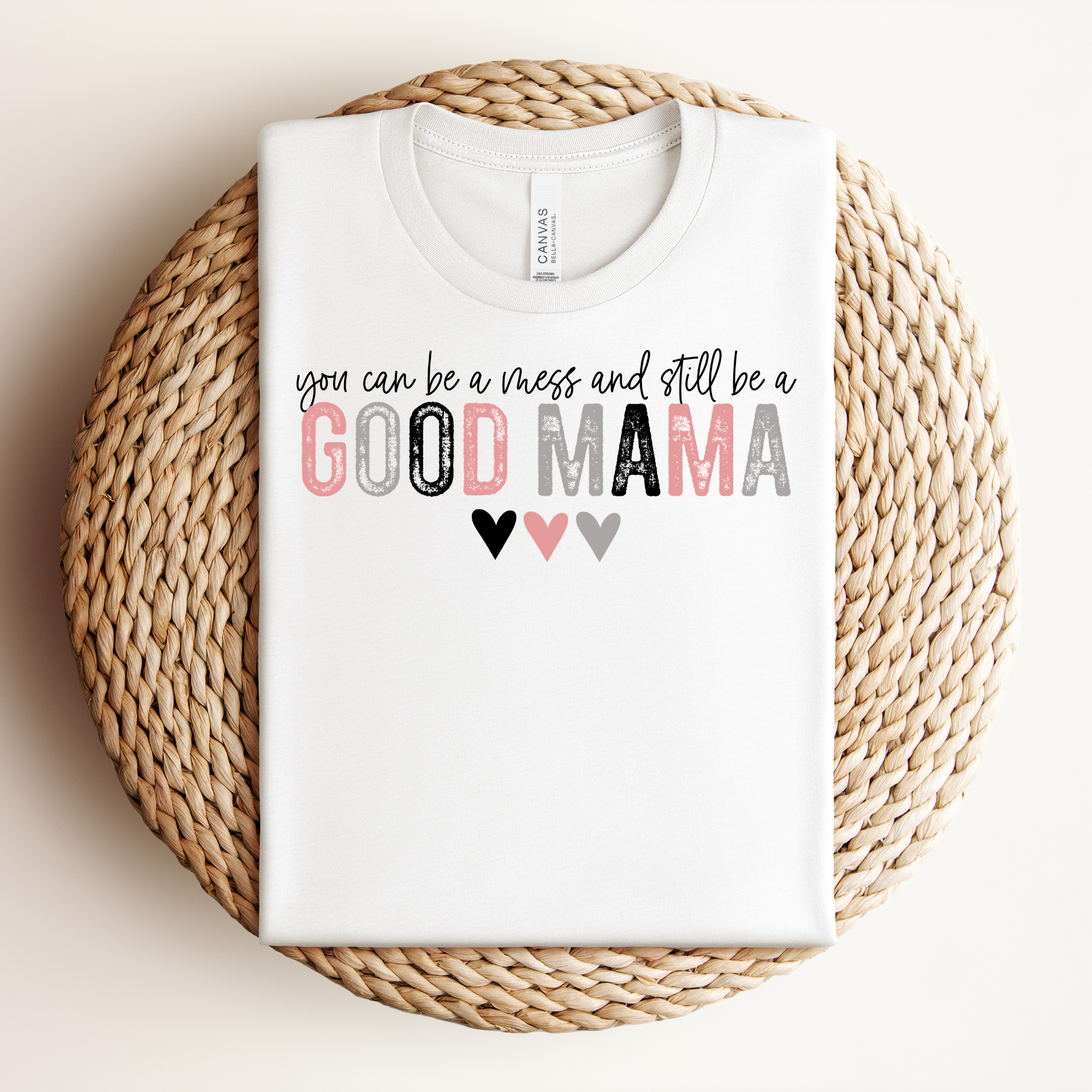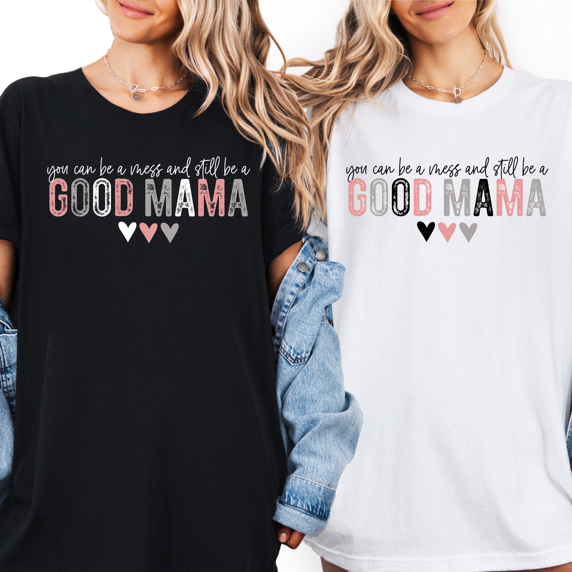 The Good Mama Tee is a gentle reminder that you don't have to have it all together to show up with love. Featuring distressed pink and gray lettering with three sweet little hearts, this tee is equal parts encouragement and everyday style — the kind of shirt that feels like a hug every time you put it on. Available in classic Black and crisp White so you can pick the one that feels most like you — or grab both! Gift it, wear it, live in it.
