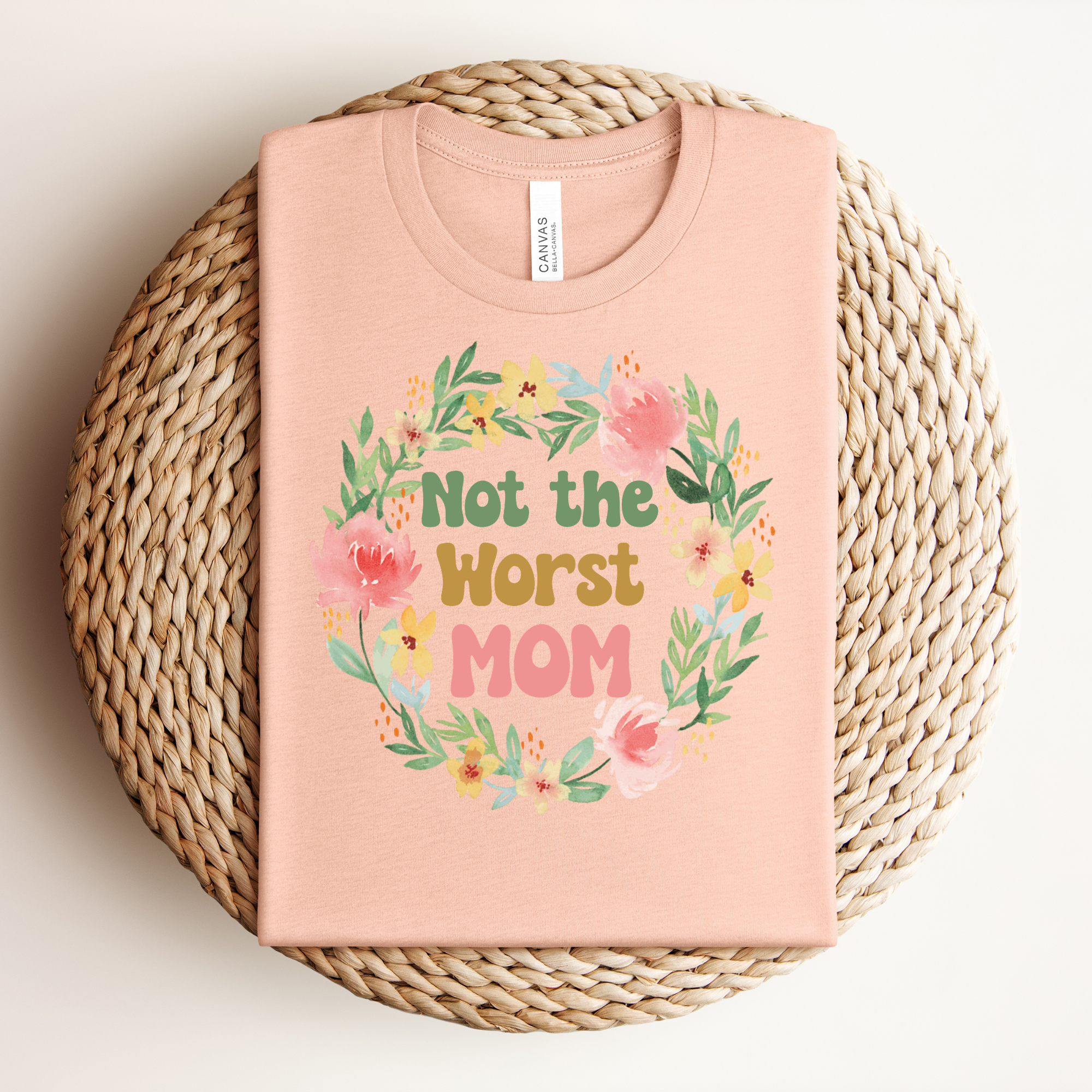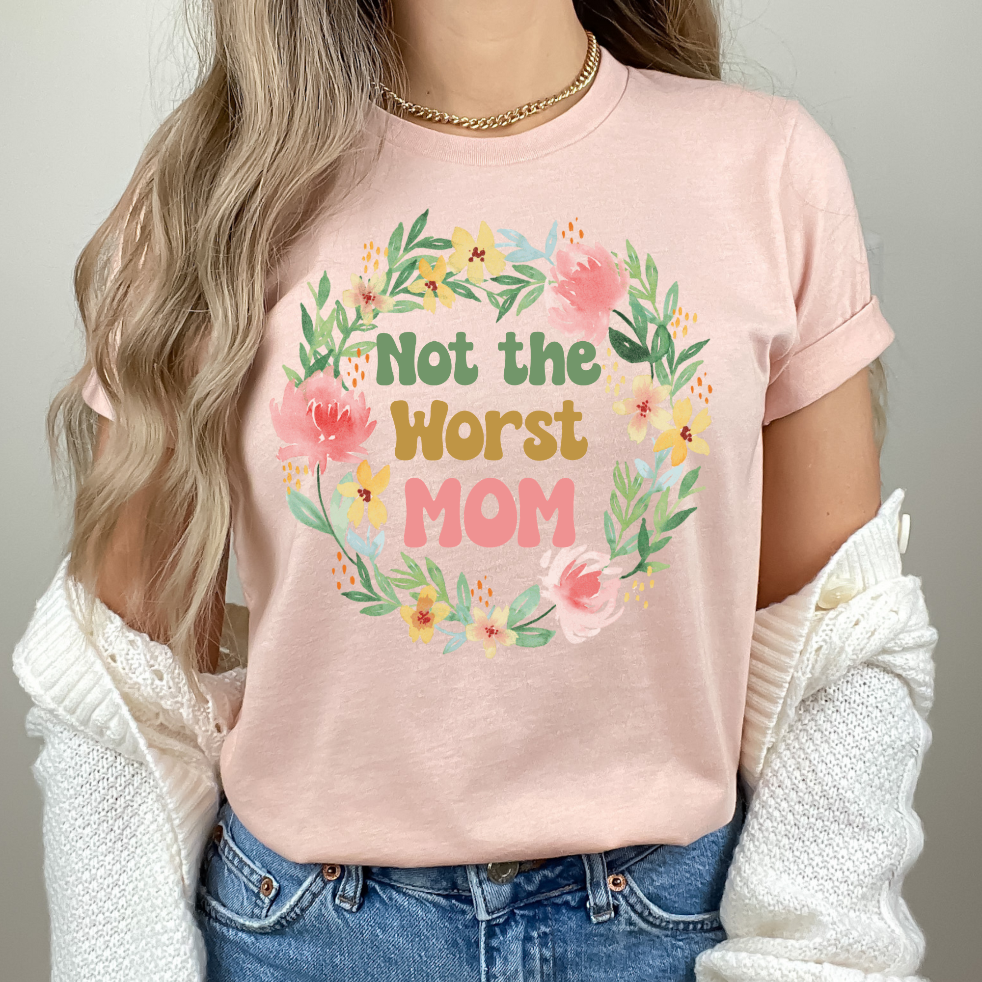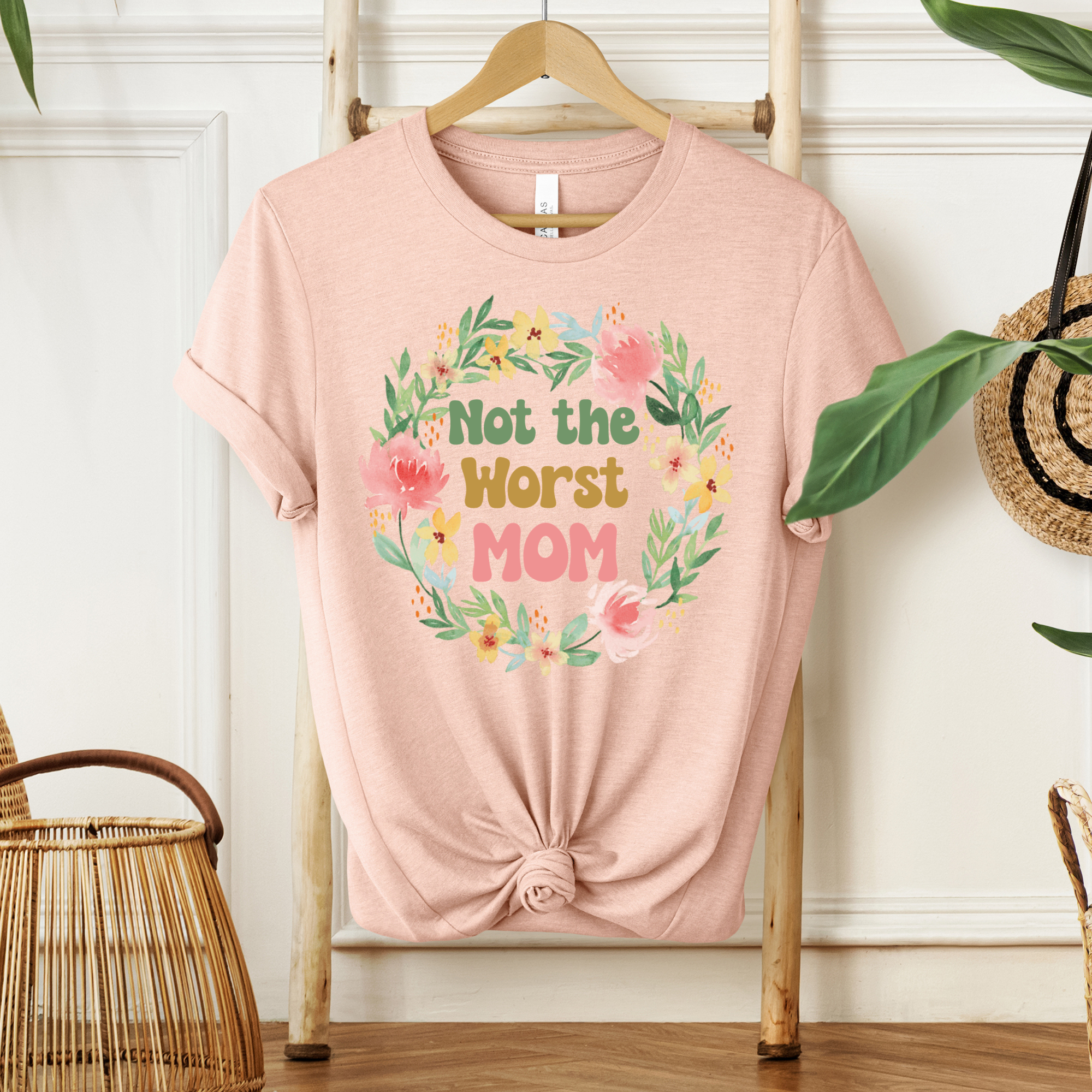 The Not the Worst Mom Tee is the perfect blend of humor and heart — because sometimes that's exactly how motherhood feels, and honestly? That's enough. Wrapped in a gorgeous watercolor floral wreath in soft pinks, greens, and gold, this tee is as beautiful as it is relatable. A wonderful gift for Mother's Day, birthdays, or just because she deserves something that makes her smile.